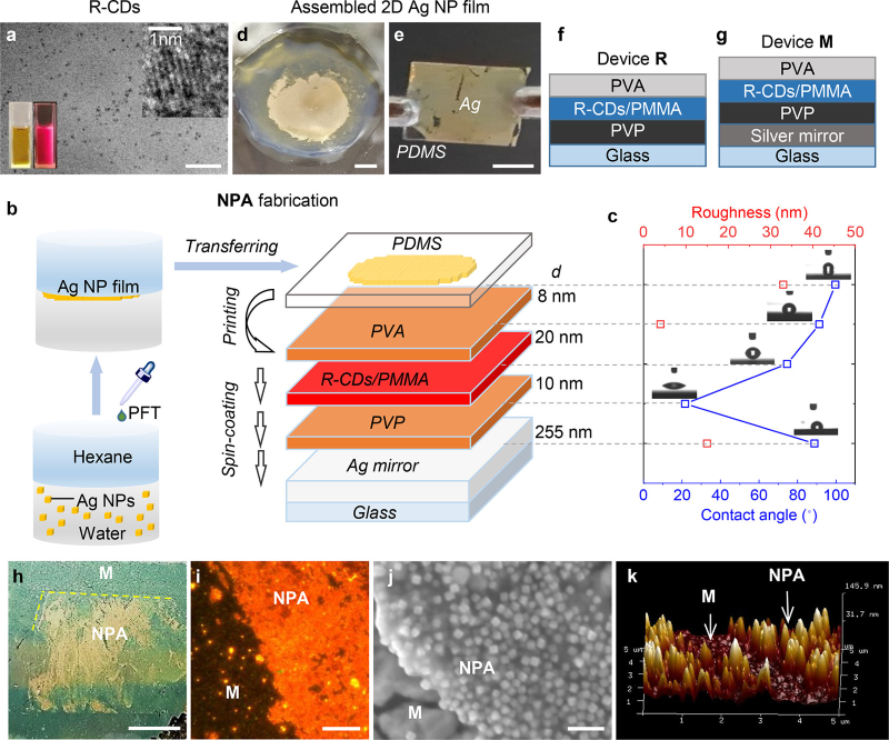 本研究的核心突破在于發(fā)展了一種結(jié)合傳統(tǒng)旋涂工藝與保形轉(zhuǎn)印薄膜技術(shù)的納米腔制造方法。該工藝首先通過(guò)溶液法自組裝制備高質(zhì)量二維銀納米顆粒薄膜,隨后利用聚二甲基硅氧烷基板進(jìn)行“拾取",并最終通過(guò)施加約1N的壓力將其轉(zhuǎn)印至預(yù)先制備的底層結(jié)構(gòu)上,從而構(gòu)建出完整的納米貼片天線結(jié)構(gòu)。此方法成功實(shí)現(xiàn)了厘米尺度(約2.5 cm2)上具有均勻質(zhì)量的等離激元納米腔的大面積制備。整個(gè)流程基于溶液化學(xué)組裝,成本低廉,并且通過(guò)模塊化的轉(zhuǎn)印技術(shù),實(shí)現(xiàn)了對(duì)發(fā)射體位置的精確控制,保證了器件性能的確定性與可重復(fù)性。