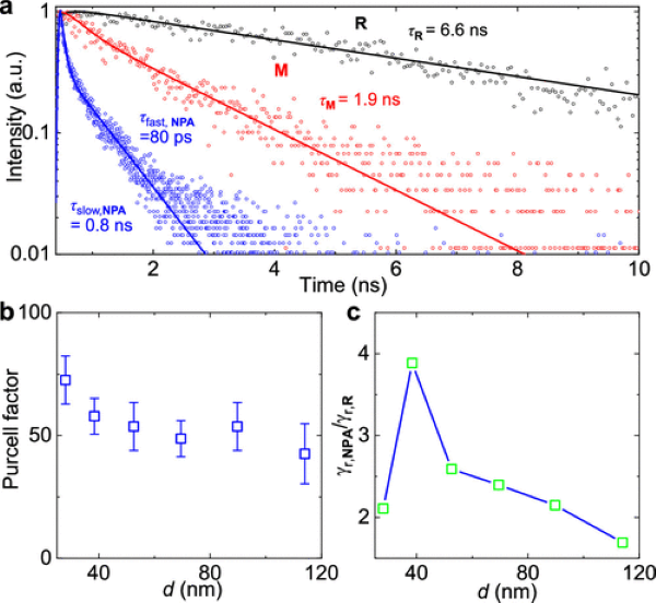 發(fā)光強(qiáng)度顯著提升:與未耦合的參考器件相比,NPA器件的發(fā)射強(qiáng)度增強(qiáng)了76倍(峰值增強(qiáng)因子達(dá)92)。時(shí)間分辨熒光壽命測(cè)試表明,耦合后的R-CDs輻射壽命從6.6納秒急劇縮短至80皮秒,計(jì)算得到的Purcell因子高達(dá)82,意味著發(fā)射速率提升了82倍。該結(jié)構(gòu)同時(shí)對(duì)碳點(diǎn)的拉曼信號(hào)產(chǎn)生了超過(guò)百萬(wàn)倍的增強(qiáng)。分析指出,發(fā)射增強(qiáng)主要源于納米腔對(duì)激發(fā)效率的巨大提升。此外,研究還觀測(cè)到強(qiáng)烈的發(fā)光偏振消光對(duì)比(約10:1),直接證明了激子-等離激元之間的耦合。