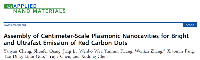 近日,中山大學(xué)陳鈺杰教授與河南大學(xué)張文凱教授團(tuán)隊(duì)在提升碳點(diǎn)固態(tài)發(fā)光性能方面取得重要進(jìn)展。通過(guò)將紅色熒光碳點(diǎn)與等離激元納米貼片天線耦合,成功在室溫下實(shí)現(xiàn)了發(fā)射強(qiáng)度增強(qiáng)76倍、輻射壽命縮短至80皮秒的明亮、超快窄帶發(fā)射。相關(guān)成果以“Assembly of Centimeter-Scale Plasmonic Nanocavities for Bright and Ultrafast Emission of Red Carbon Dots"為題發(fā)表在國(guó)際知*期刊《ACS Applied Nano Materials》上。
